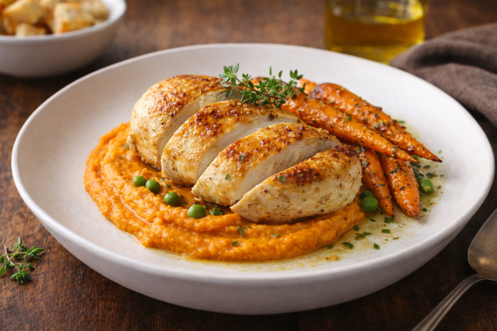 Du velouté de petits pois à la menthe fraîche, au suprême de volaille fermière accompagné de carottes confites, jusqu’à la tarte fine aux pommes et caramel beurre salé, chaque plat est pensé pour offrir une expérience gourmande, conviviale et authentique.